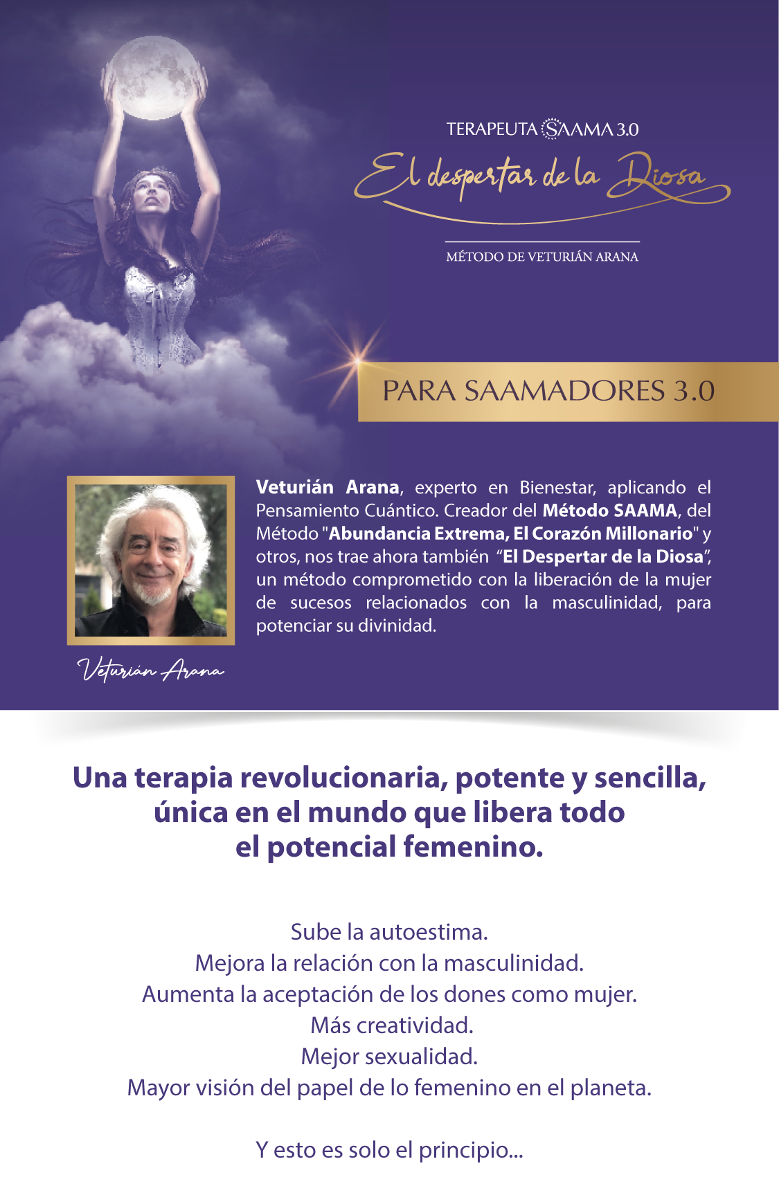 Veturián Arana, creador del Método SAAMA, nos enseña con esta Terapia cómo liberar todo el potencial de la mujer borrando los enlaces con eventos del pasado que la bloquean en el presente.